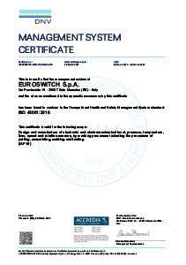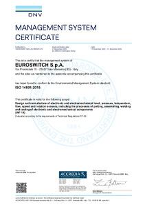 EUROSWITCH ist ein Unternehmen, das über die Zertifizierung UNI EN ISO 9001, die internationale Norm über die Anforderungen für das Qualitätsmanagementsystem im Unternehmen, und über die Zertifizierung für das Umweltmanagementsystem UNI EN ISO 14001 verfügt. Letztere bescheinigt, dass die Firmenpolitik die Rechtsvorschriften und Informationen über bedeutende Umwelteinflüsse beachtet.