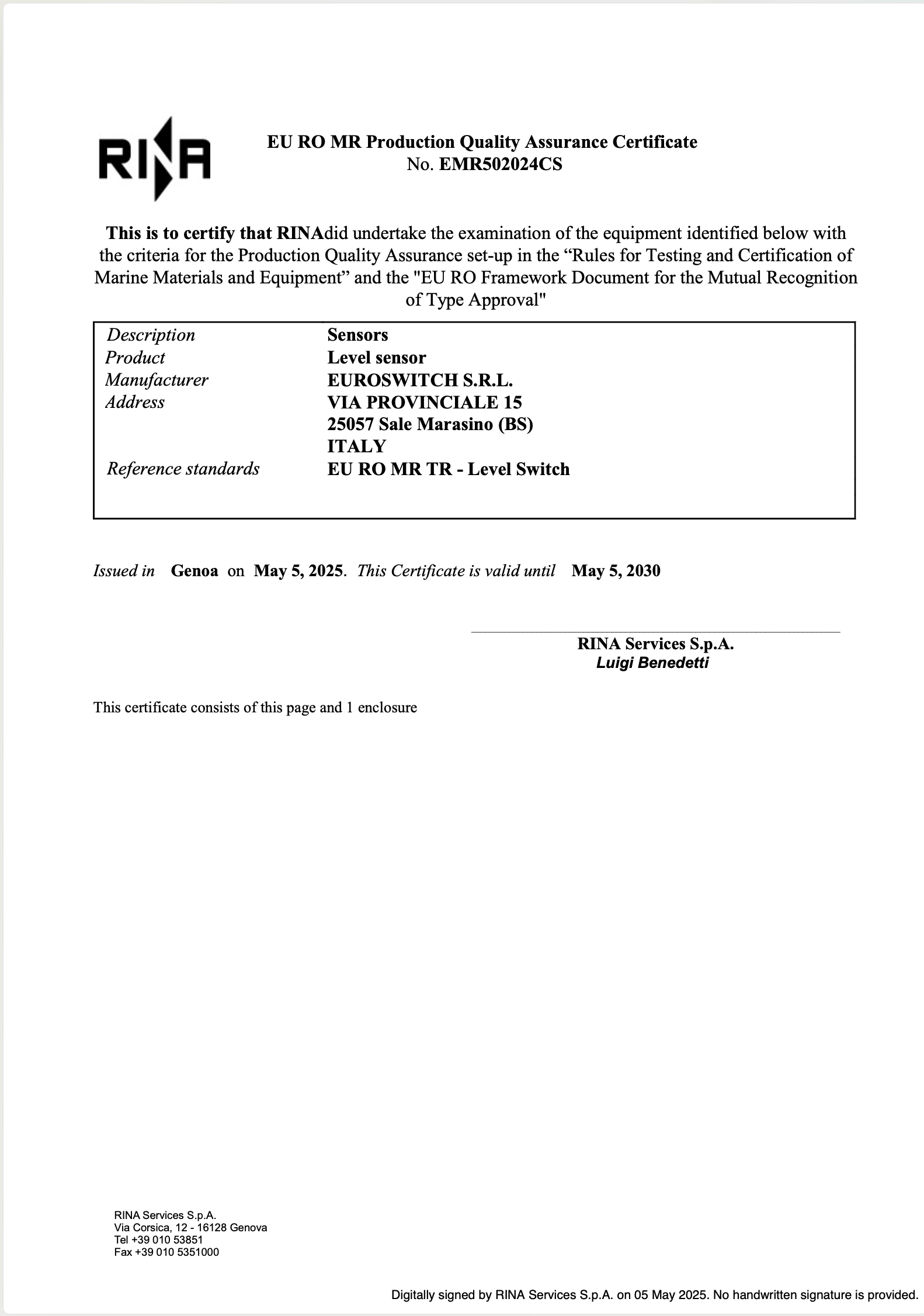 Euroswitch ist ein führendes Exzellenzunternehmen in der Entwicklung und Herstellung von Druck-, Füllstand-, Temperatur- und Rotationssensoren. Sein Qualitätsmanagementsystem ist nach der Norm UNI EN ISO 9001, sein Umweltmanagementsystem nach der Norm UNI EN ISO 14001 zertifiziert und mit Management-Zertifizierung für Gesundheit und Sicherheit am Arbeitsplatz UNI EN 45001.